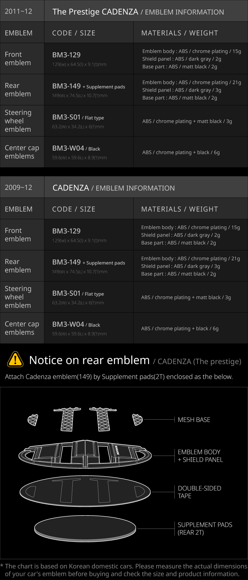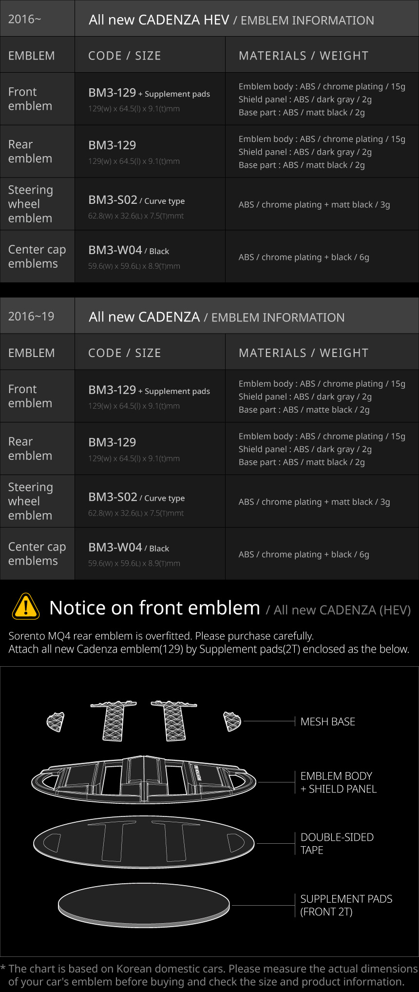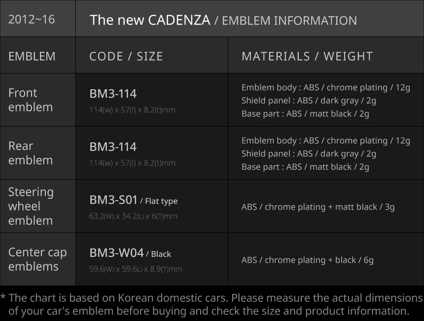• The emblem size list is based on vehicles released in South Korea. Emblem sizes may vary by country and trim level.