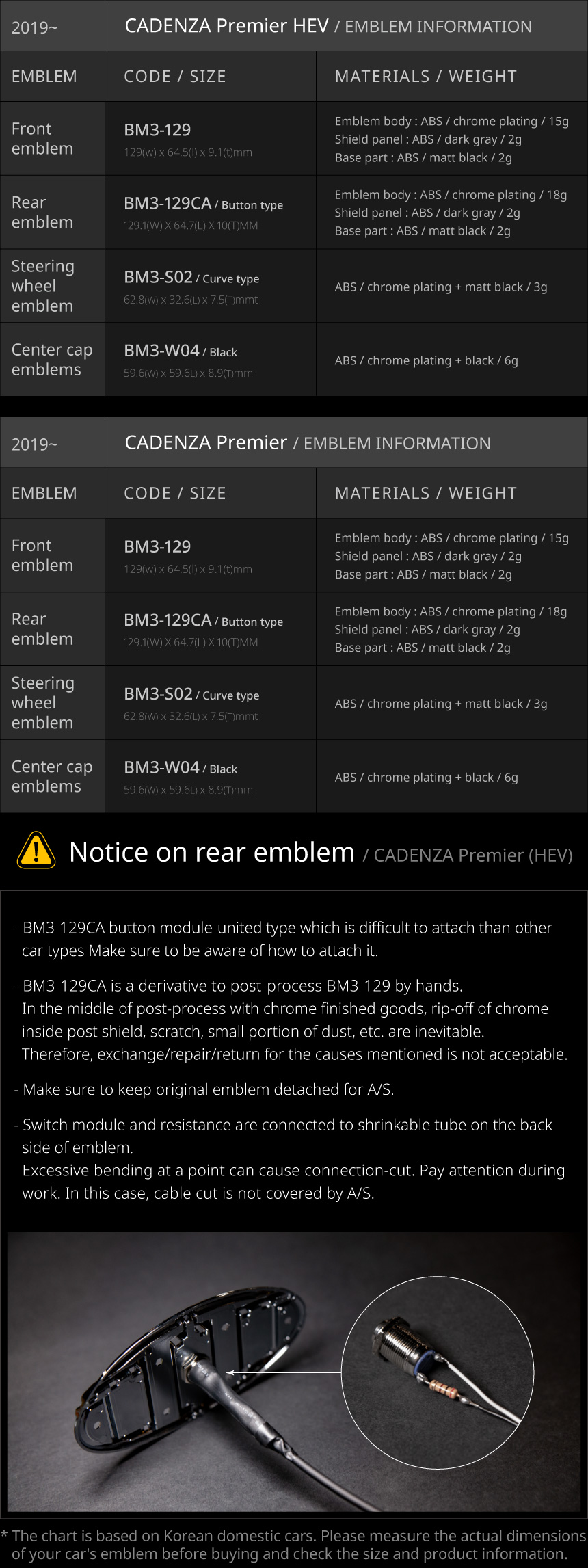 | The size of the emblem may vary depending on the vehicle model year and country, so please check the size of the front and rear emblem of your vehicle before you install it and purchase it after checking the compatibility. |