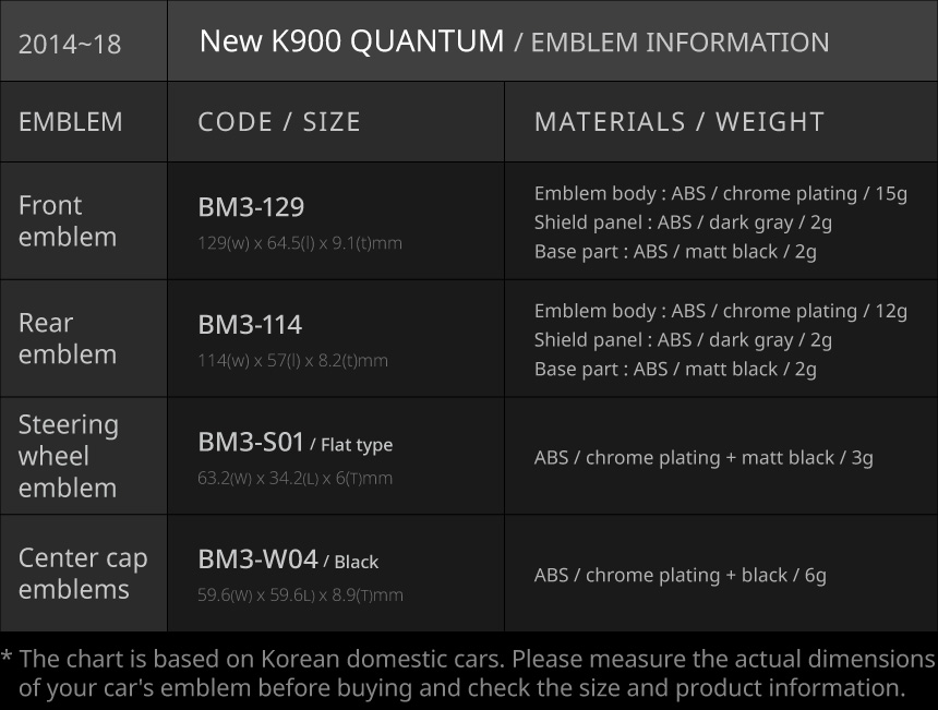 • The emblem size list is based on vehicles released in South Korea. Emblem sizes may vary by country and trim level.