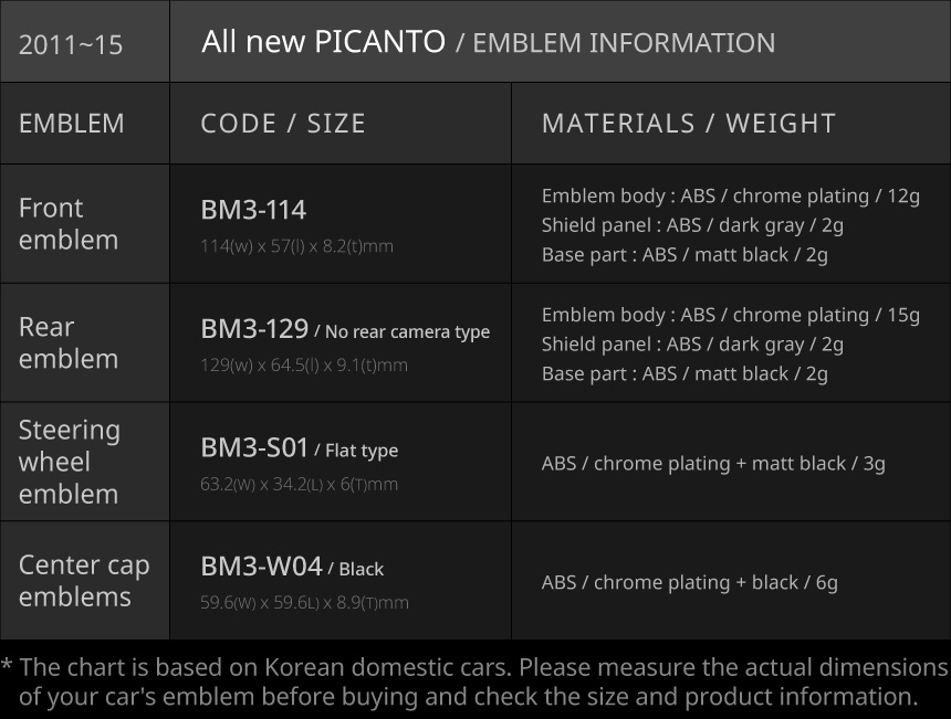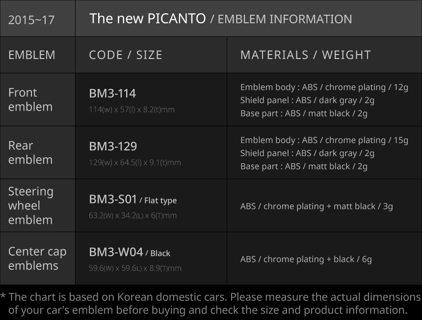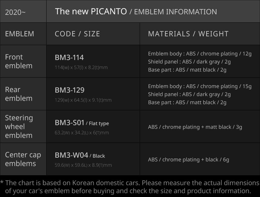 • The emblem size list is based on vehicles released in South Korea. Emblem sizes may vary by country and trim level.