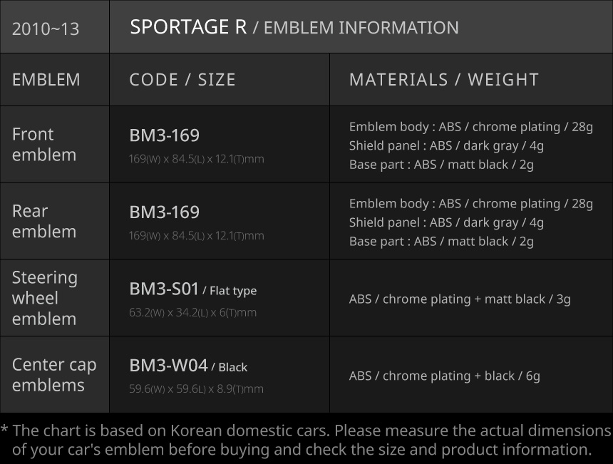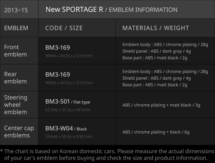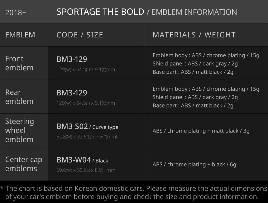 • The emblem size list is based on vehicles released in South Korea. Emblem sizes may vary by country and trim level.
