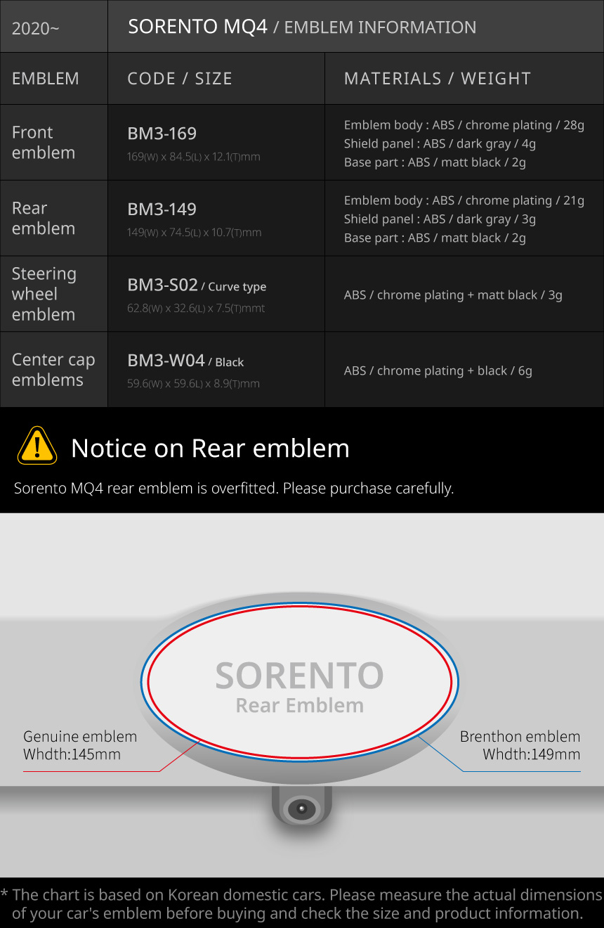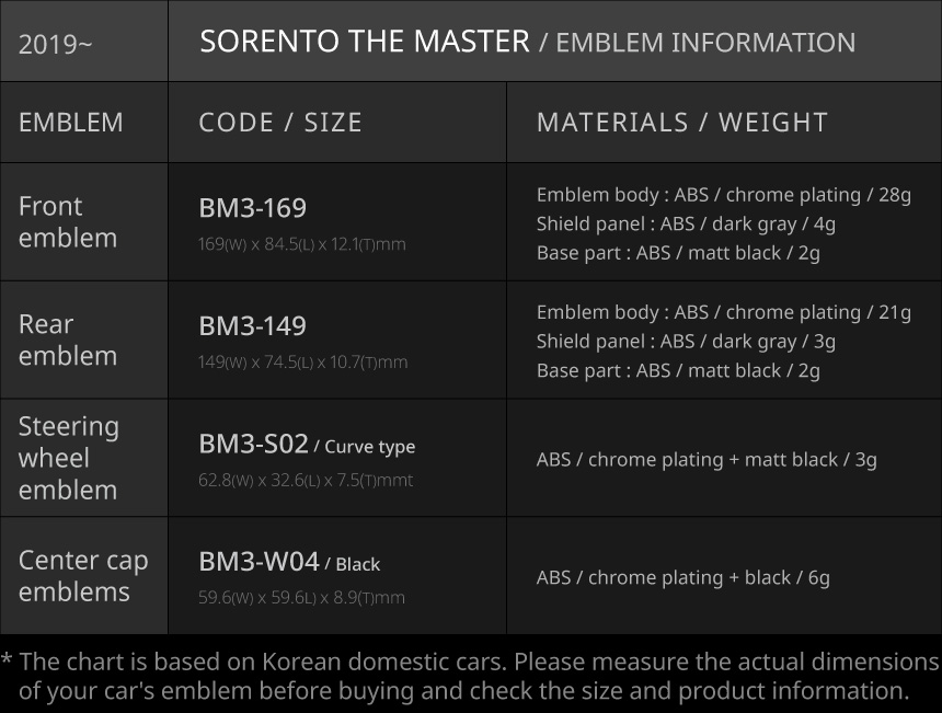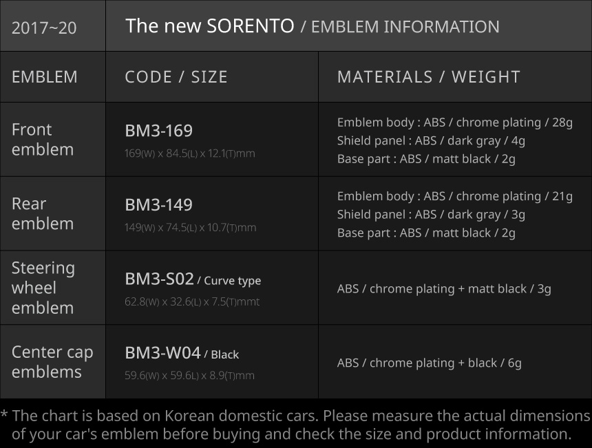 • The emblem size list is based on vehicles released in South Korea. Emblem sizes may vary by country and trim level.
