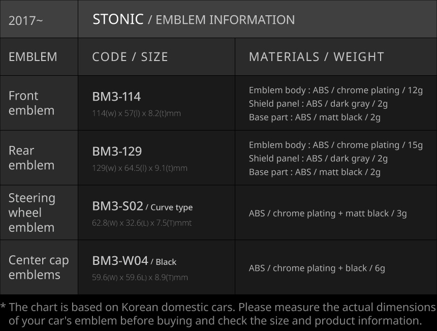 • The emblem size list is based on vehicles released in South Korea. Emblem sizes may vary by country and trim level.
