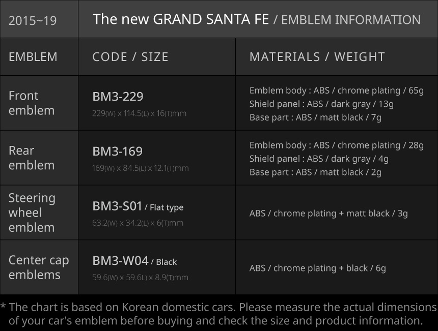 • The emblem size list is based on vehicles released in South Korea. Emblem sizes may vary by country and trim level.