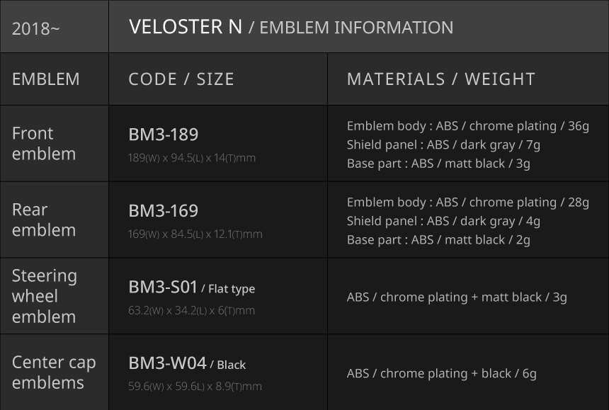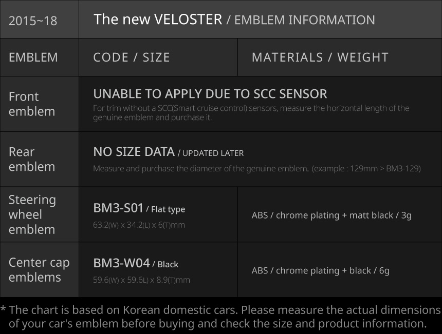 • The emblem size list is based on vehicles released in South Korea. Emblem sizes may vary by country and trim level.