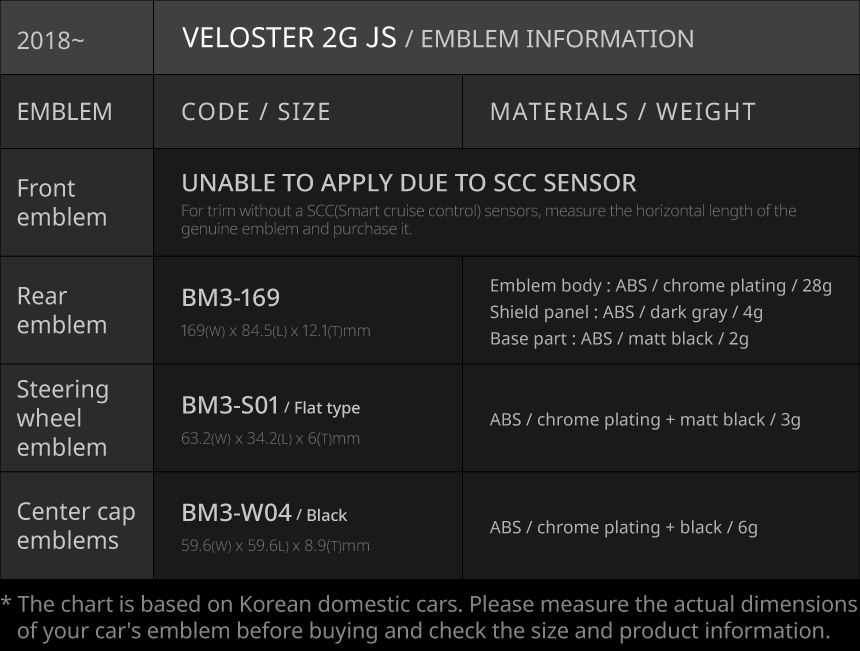 | The size of the emblem may vary depending on the vehicle model year and country, so please check the size of the front and rear emblem of your vehicle before you install it and purchase it after checking the compatibility. |