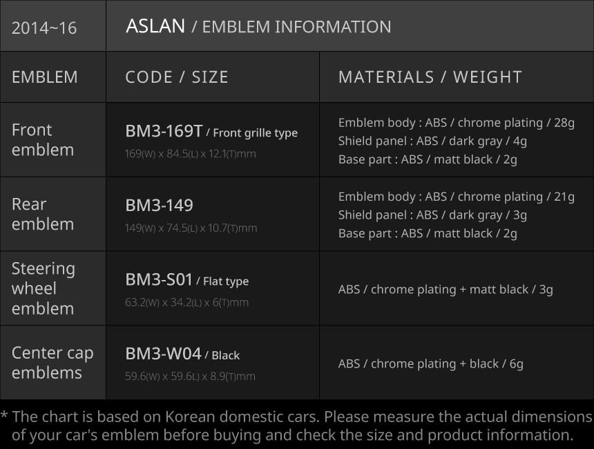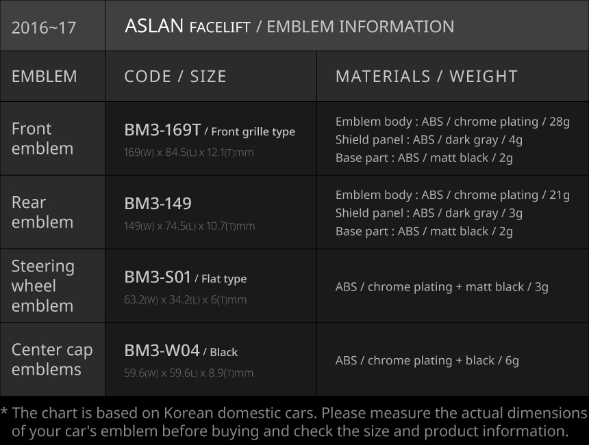 • The emblem size list is based on vehicles released in South Korea. Emblem sizes may vary by country and trim level.