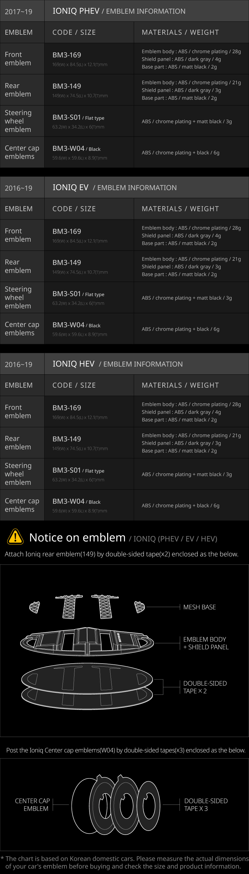| The size of the emblem may vary depending on the vehicle model year and country, so please check the size of the front and rear emblem of your vehicle before you install it and purchase it after checking the compatibility. |