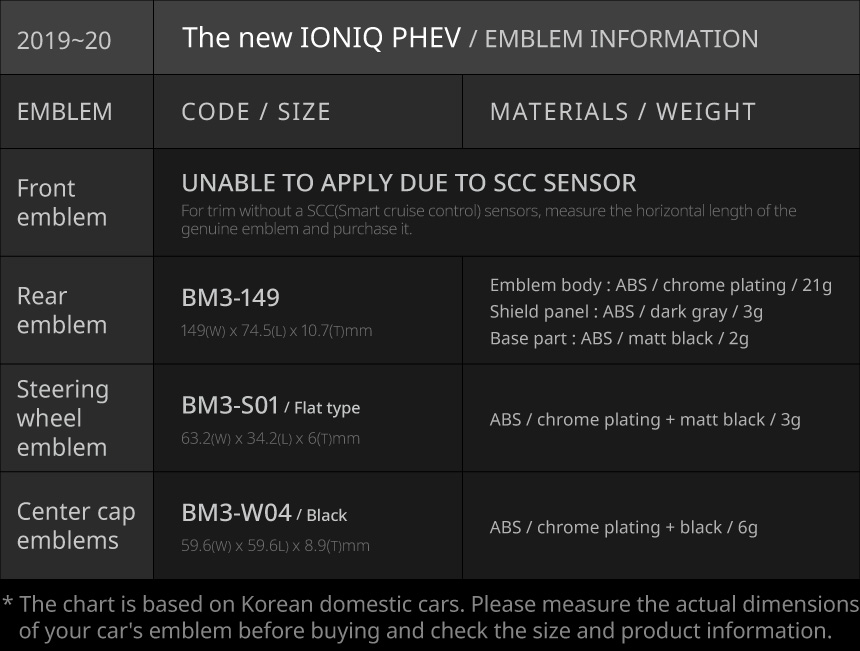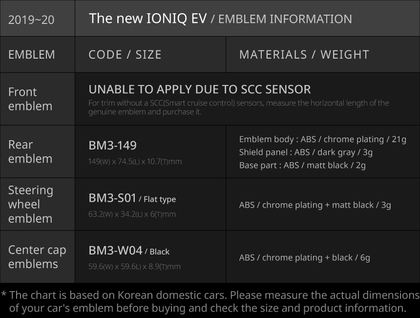 • The emblem size list is based on vehicles released in South Korea. Emblem sizes may vary by country and trim level.