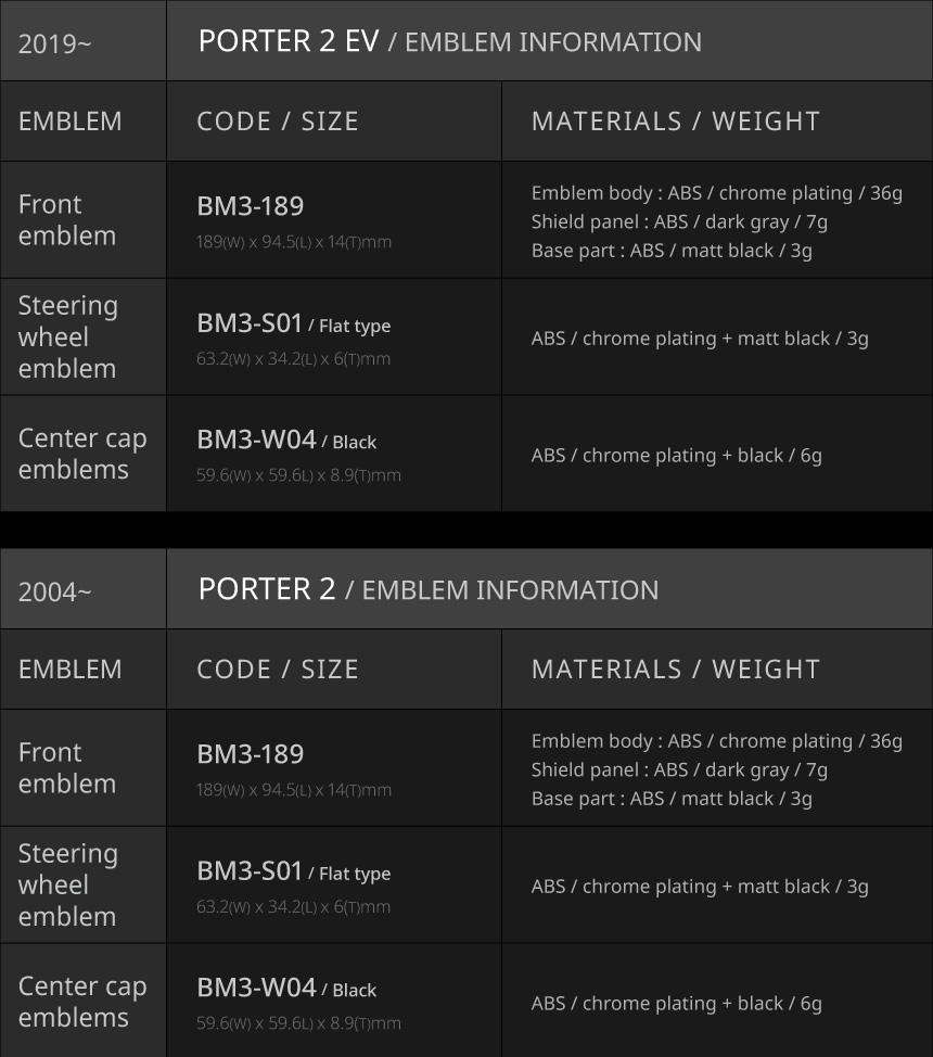• The emblem size list is based on vehicles released in South Korea. Emblem sizes may vary by country and trim level.