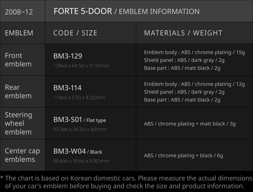 • The emblem size list is based on vehicles released in South Korea. Emblem sizes may vary by country and trim level.