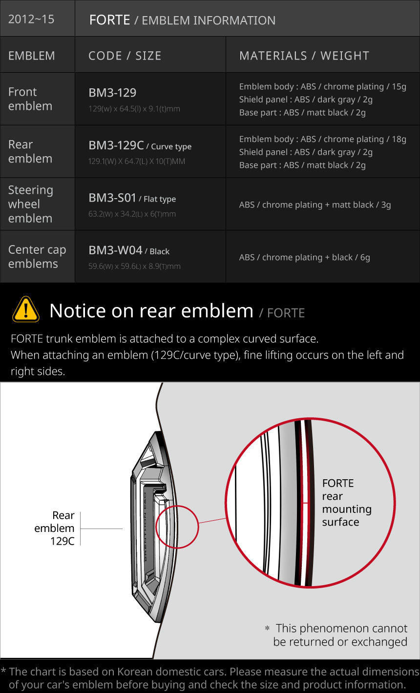 | The size of the emblem may vary depending on the vehicle model year and country, so please check the size of the front and rear emblem of your vehicle before you install it and purchase it after checking the compatibility. |